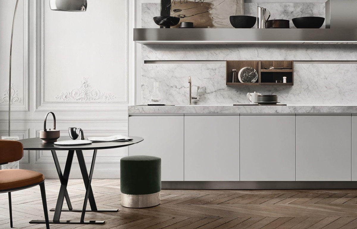 A large accessorised wall teams with the work island and provides unobtrusive storage for food and tools. In the middle stand two accessorised units, hidden by New Pocket System disappearing doors. These open to provide perfect working conditions in the kitchen, offering extra work areas.